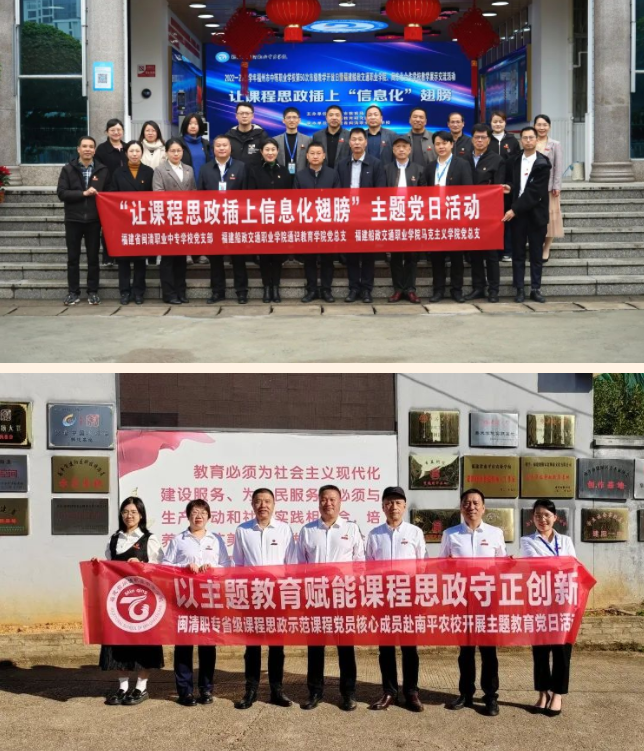 以省级课程思政示范课程建设为抓手,不断推进学校主题教育走深走实。认真贯彻习近平总书记关于“党建工作是办学治校的基本功,思政工作是学校各项工作的生命线”重要指示精神,努力练好“基本功”,攥紧“生命线”,开创学校“党建+思政”工作新局面。积极打造《信息技术》课程思政精品课程,发挥省级课程思政示范课程名师团队辐射、带动作用,营造“课程门有思政,教师人人讲育人”氛围,不断探索知识传播、能力培养与价值引领同频共振的有效途径;创新党日活动形式和载体,与福建船政交通职业学院马克思主义学院、通识教育学院党总支联合开展“让课程思政插上信息化翅膀”主题党日活动,积极推进中高职课程思政和思政课程一体化建设,实现“各门课都要守好一段渠、种好责任田,使各类课程与思想政治理论课同向同行,形成协同效应”目标;前往南平农校与南平、福州七所合作学校开展“以主题教育赋能课程思政守正创新”主题党日活动,进一步推进我校党建思政工作融合发展再创新局面、课程思政守正创新再上新台阶。