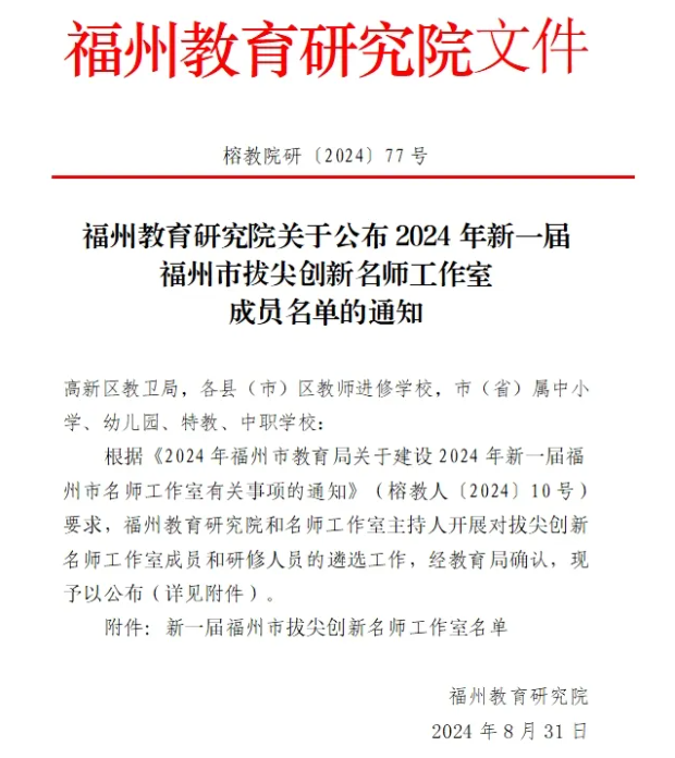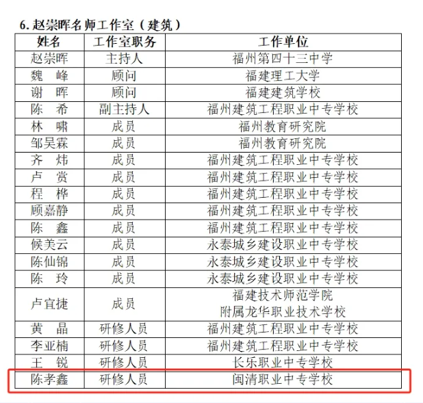在福州教育研究院关于2024年新一届福州市拔尖创新名师工作室成员名单公布中,我校教师陈孝鑫入选赵崇晖名师工作室(建筑)研修人员。