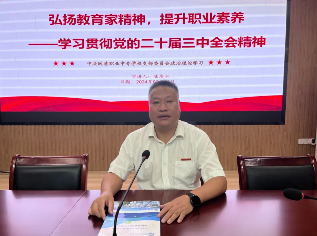 为了深入学习习近平总书记在党的二十届三中全会上的重要讲话精神,认真研读全会审议通过的《中共中央关于进一步全面深化改革、推进中国式现代化的决定》,深刻理解党的二十届三中全会提出的一系列重大理论观点、重大工作部署。9月2日,闽清县教育局党组成员、闽清职专书记校长陈友水带头宣讲解读党的二十届三中全会精神,将全会精神与教育工作实际结合起来,推动全会精神入脑入心。