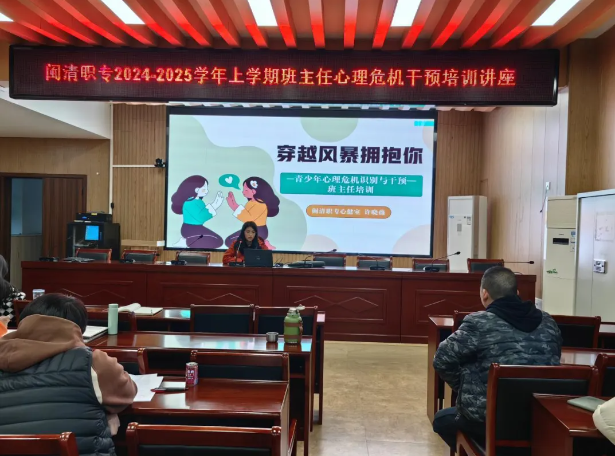 2024年12月13日下午,闽清职业中专学校组织班主任培训,聚焦学生心理危机识别与干预。旨在通过专业指导、经验分享,提升班主任相关能力,使其能更好识别、应对、处理学生心理危机,为学生健康成长保驾护航,进一步加强学校心理健康教育工作。
