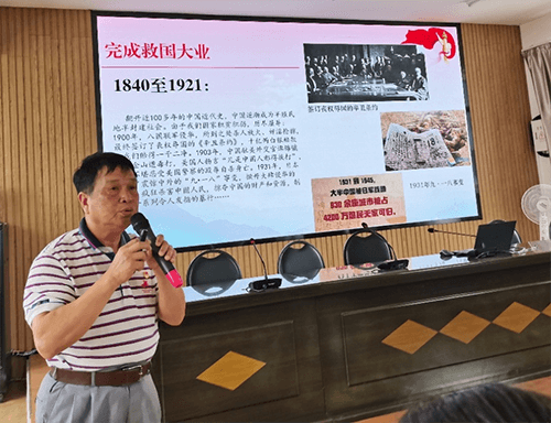 林济杰同志以《奋斗百年路,启航新征程》为题,结合党的奋斗历程,围绕“不忘初心、高举旗帜”主题,追根溯源,全面梳理了中国共产党在民主革命时期、社会主义革命时期、改革开放时期以及新时代中国特色社会主义建设时期一系列奋斗史。