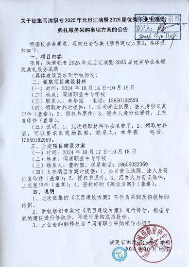 关于征集闽清职专2025年元旦汇演暨2025届优秀毕业生颁奖典礼服务采购事项方案的公告