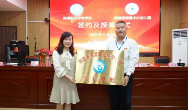 闽清职专陈友水校长向闽清梅溪镇中心幼儿园刘枫园长授校企实训基地牌匾