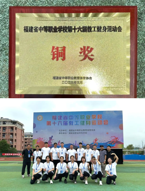 最美人间五月天。在这暖意融融,草长莺飞的季节里,福建省中等职业学校第十六届教工健身运动会于2023年5月20日在闽侯职专隆重开幕。闽清职专组成了以陈友水校长领衔的代表队参赛,一举夺得团体总分铜奖的好成绩!
