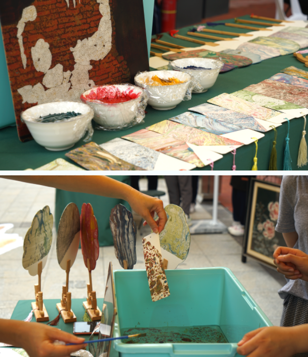 漂漆是流动的艺术。漂漆的魅力在于它一半人为,一半天成,其偶然性的组合,各色各样的纹路,往往都是惊喜。每一幅漂漆作品都是一个独一无二的艺术品。在现场展示期间福州市市委领导到现场并亲手体验制作了漂漆扇子,当漆飘在水面上,形成发散的色块,极具生命感和随机性,素色的扇子与书签浸入漂流漆中,一搅,一起,水因势而走的痕迹保留了下来,形成美轮美奂的大漆肌理,各种颜色穿插交错,跃然纸上,令人不禁陶醉其中。