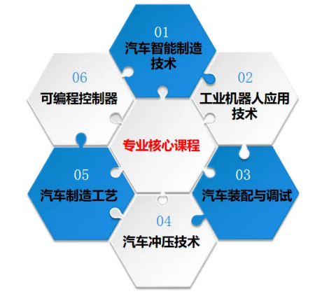 汽车电工电子、汽车机械基础、发动机构造、汽车底盘构造、汽车电器与电子技术、汽车检测与故障诊断、发动机电控技术、可编程控制器、汽车智能制造技术、工业机器人应用技术、汽车装配与调试、汽车冲压技术等。