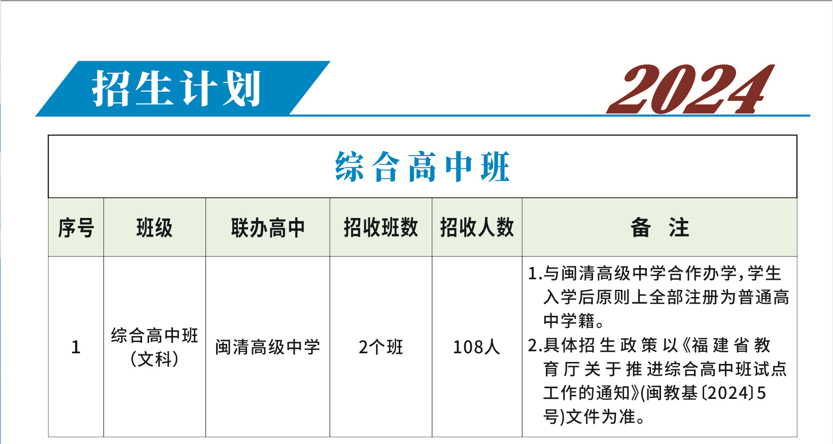 2024年秋季,我校作为综合高中班试点之一的公办中等职业学校,在本校设立了2个综合高中班(文科)。