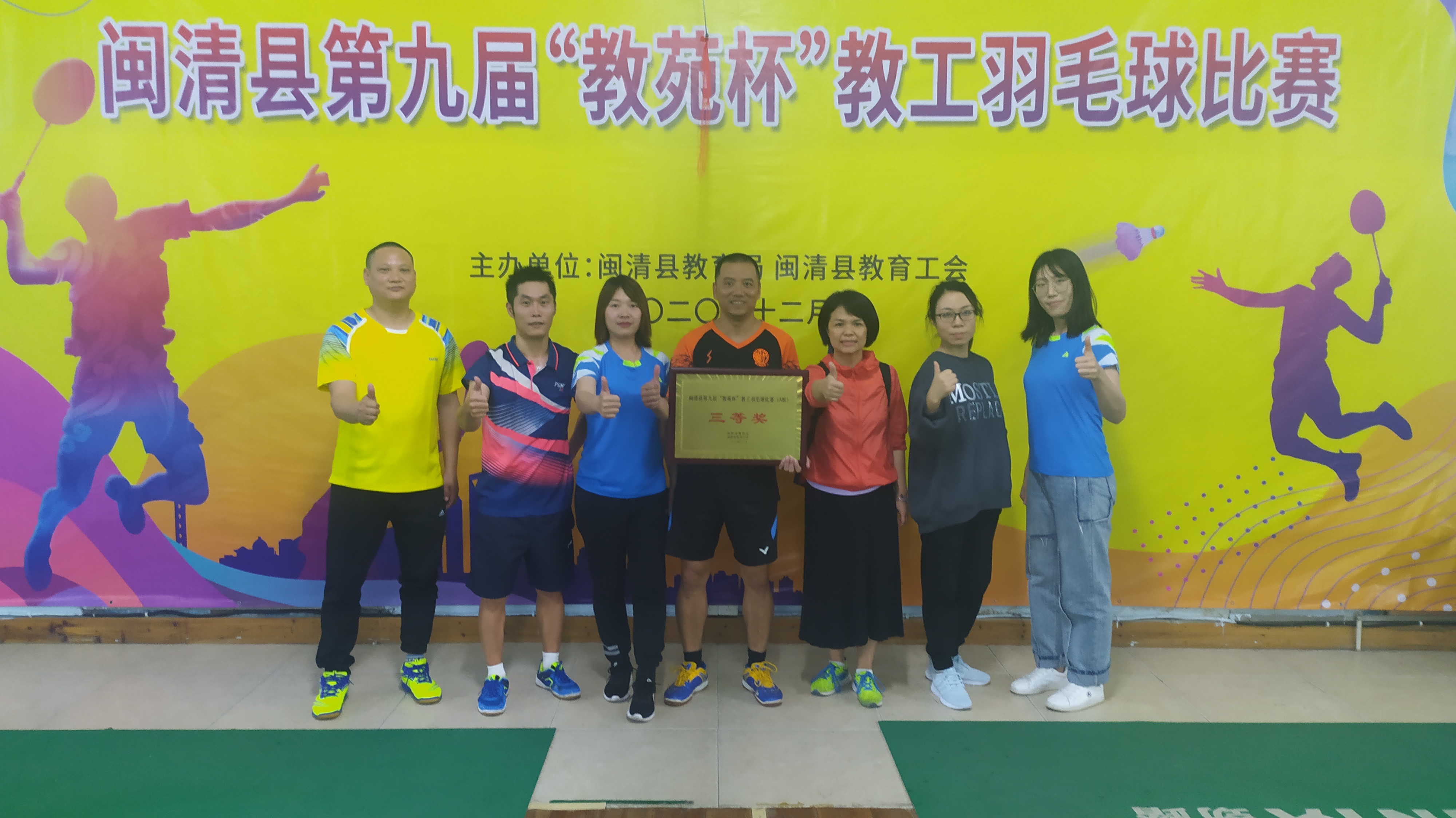 12月6日,闽清县教育局、闽清县教育工会在闽清县羽毛球馆举办第九届"教苑杯"教职工羽毛球比赛,我校杨矩强、谢扬平、刘进武、林蕾、董甜蜜、瞿荣、陈玉玲、刘艳敏、陈凤炆九位老师组成闽清职专代表队参加比赛,不负众望获得三等奖。