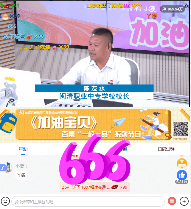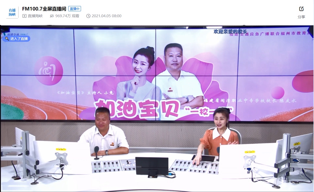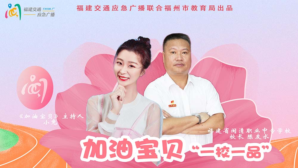 由福建交通应急广播《加油宝贝》栏目联合福州市教育局特别推出的系列节目《一校一品》专场!在2021年6月15日---6月30日播出。6月23日下午2:00,闽清职专陈友水校长做客《加油宝贝》百集“一校一品”节目直播间。
