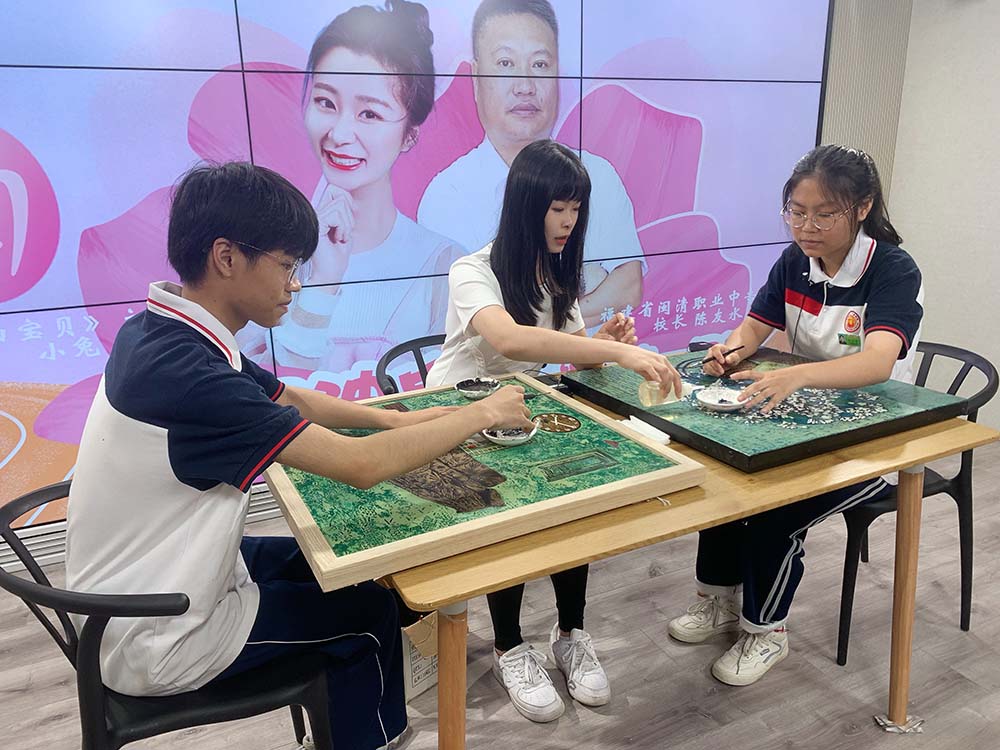 直播间里,陈友水校长接受《加油宝贝》主持人小兔访谈,参加访谈还有漆艺专业教师陈凤炆和两位漆艺专业同学。