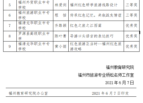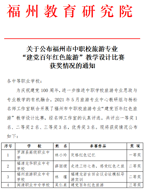 关于公布福州市中职校旅游专业 “建党百年红色旅游”教学设计比赛 获奖情况的通知