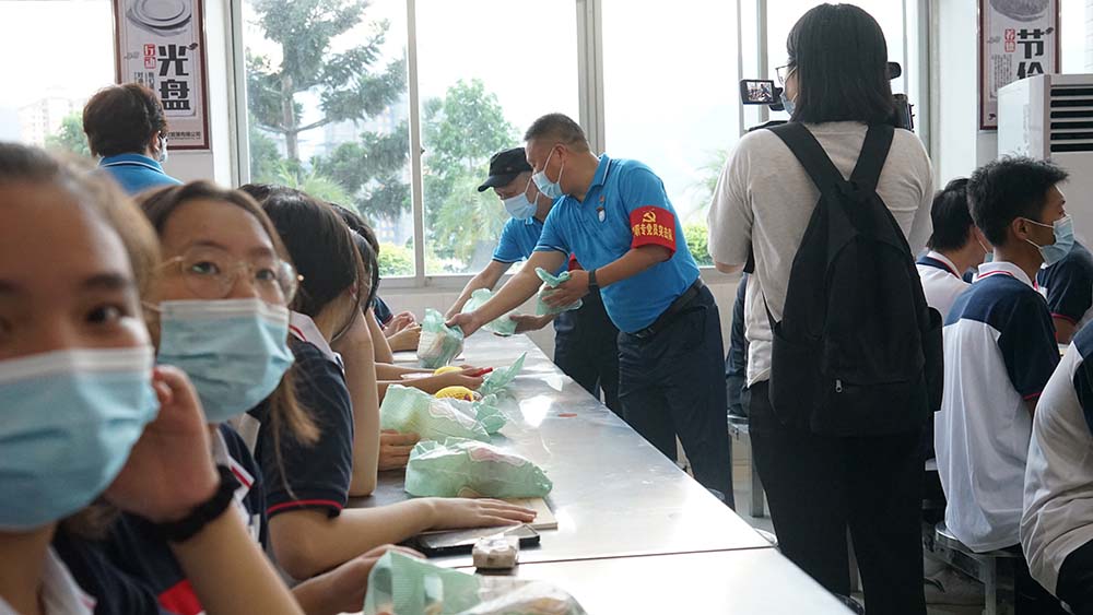 在《感谢你》的乐曲声中,学校领导带领党员突击队员为学生发放月饼、时令水果、学习用品等中秋礼物,传达了学校对同学们亲切的关怀和美好的祝福。