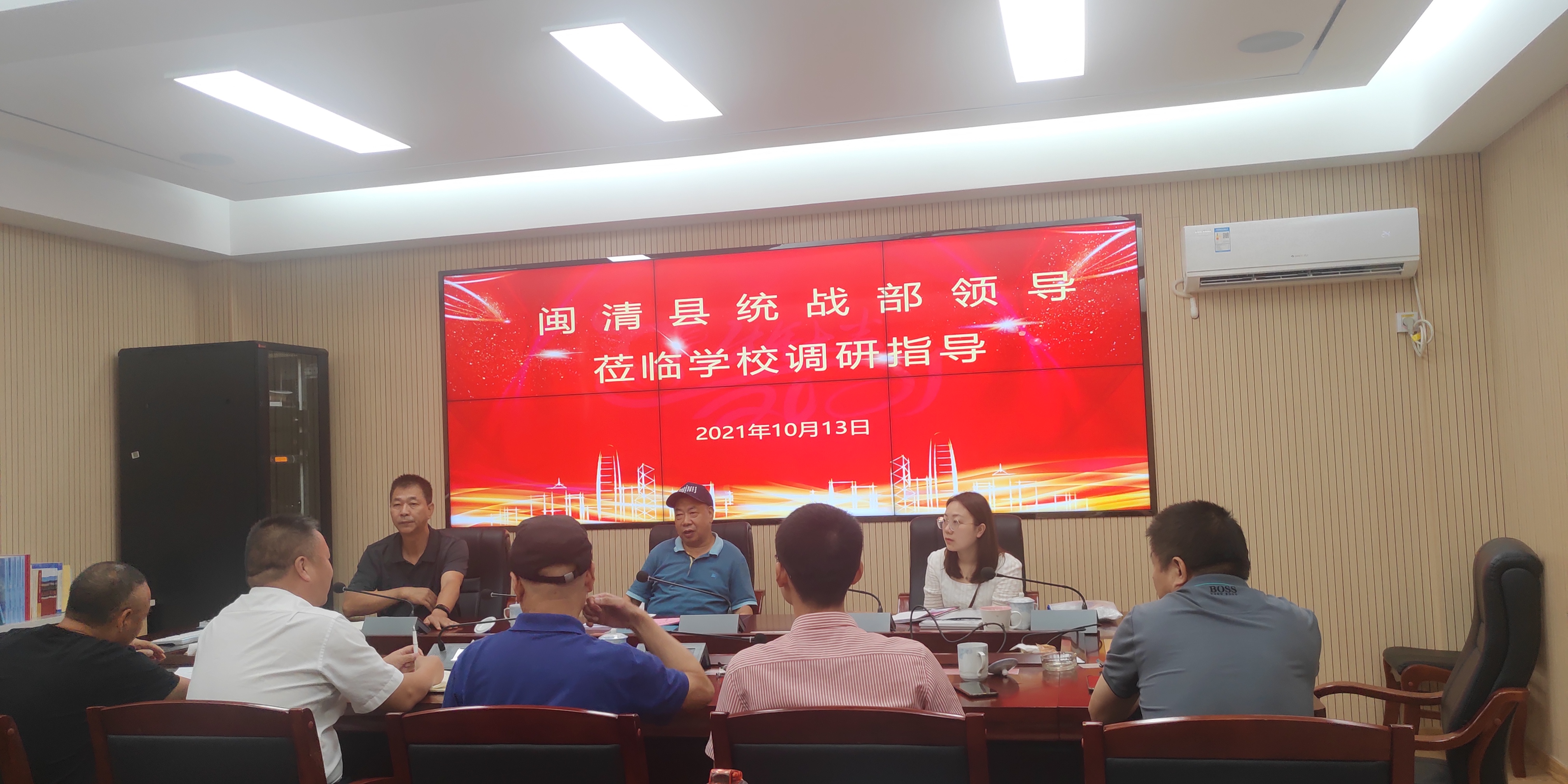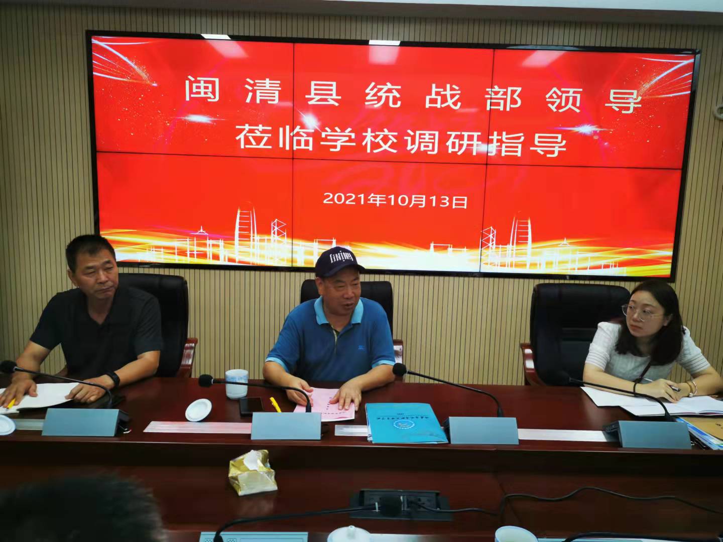 2021年10月13日上午9点,闽清县委统战部池建开副部长莅临学校调研指导工作,闽清县教育局方儒钦副局长,闽清职专陈友水校长,林萍书记及其他校级领导出席调研座谈会,座谈会由林萍书记主持。
