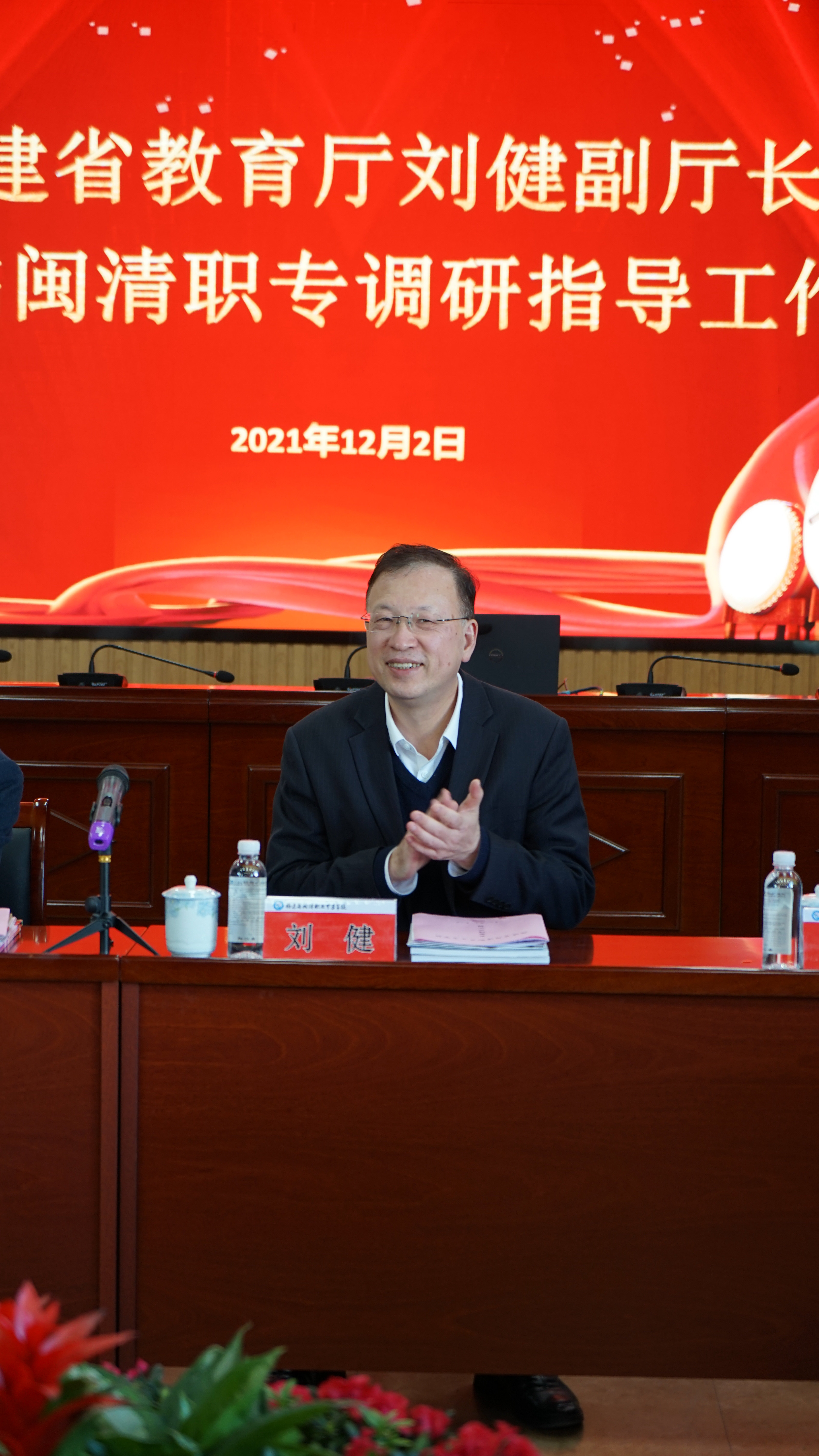 林燕青副书记代表闽清县委县政府对刘健副厅长一行莅临闽清职专调研表示热烈欢迎和衷心感谢,希望闽清职专在船政交通学院引领下,结合地域经济社会发展,抓好专业建设,发挥旅游、建筑等专业办学优势,培养更多适用型、技能型人才,服务闽清发展战略,助力闽清经济发展。