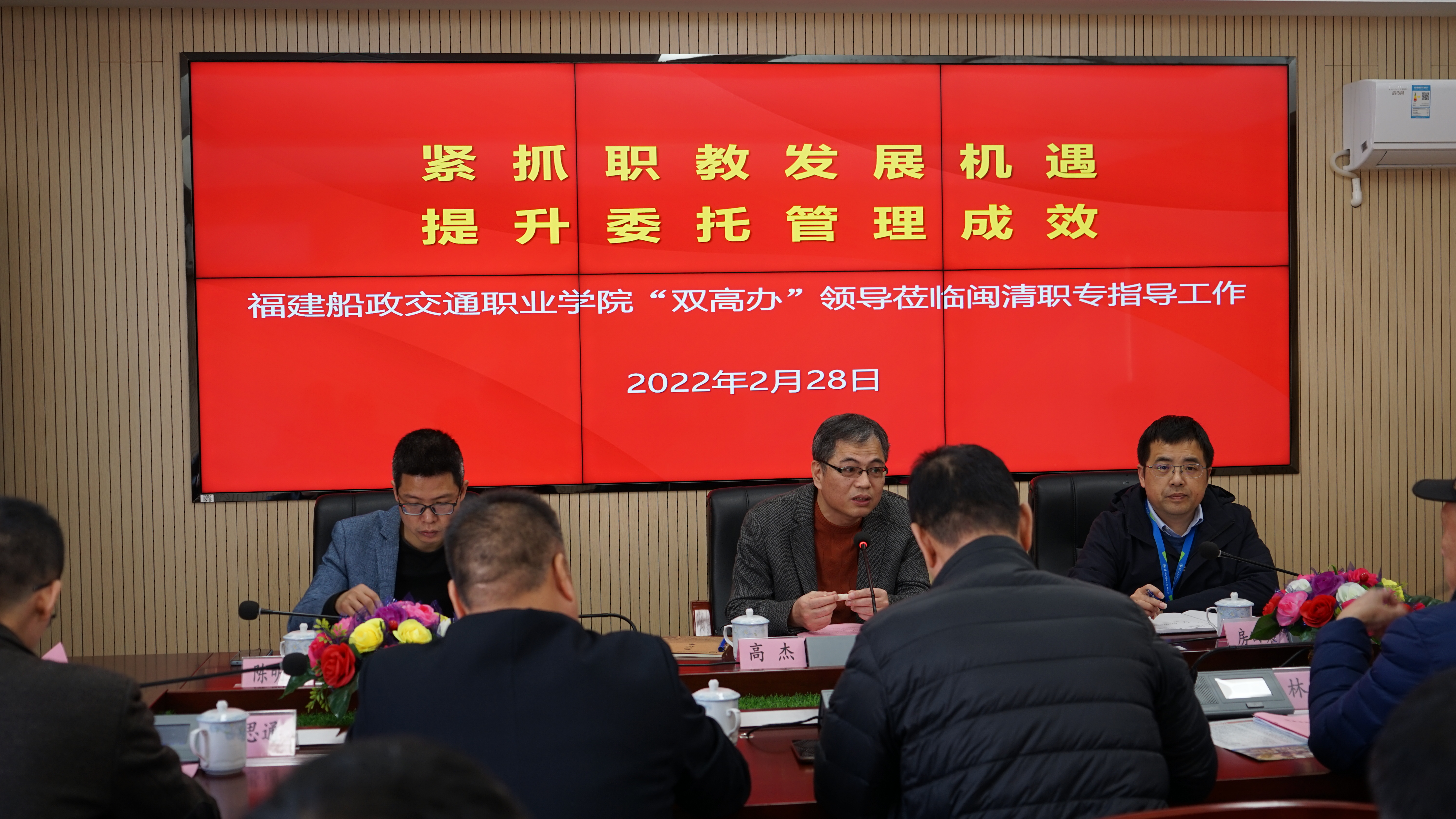 2022年2月28日上午,福建船政交通职业学院“双高”建设领导小组常务副组长、土木工程学院党总支书记高杰,“双高”建设办公室主任、经济与管理学院院长房曰荣,安全与环境学院院长陈明仙到我校开展委托管理成效调研指导工作。闽清教育局副局长方儒钦教授,闽清职专校长陈友水,书记林萍及闽清职专其他校级领导和相关处室负责人陪同调研座谈。