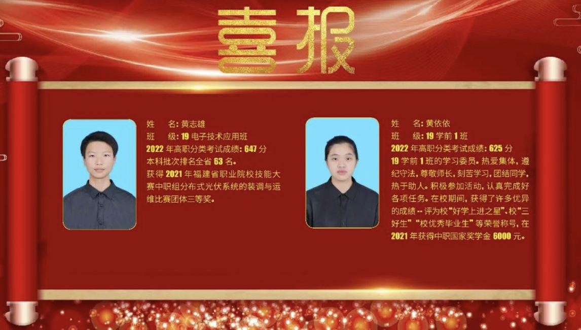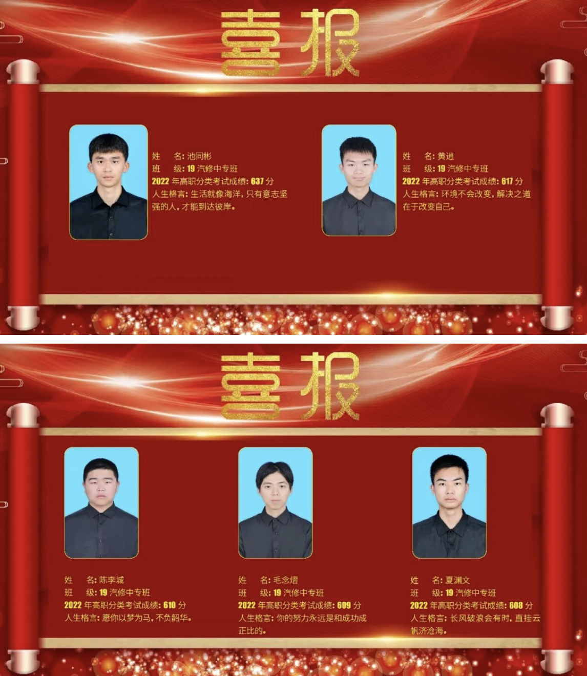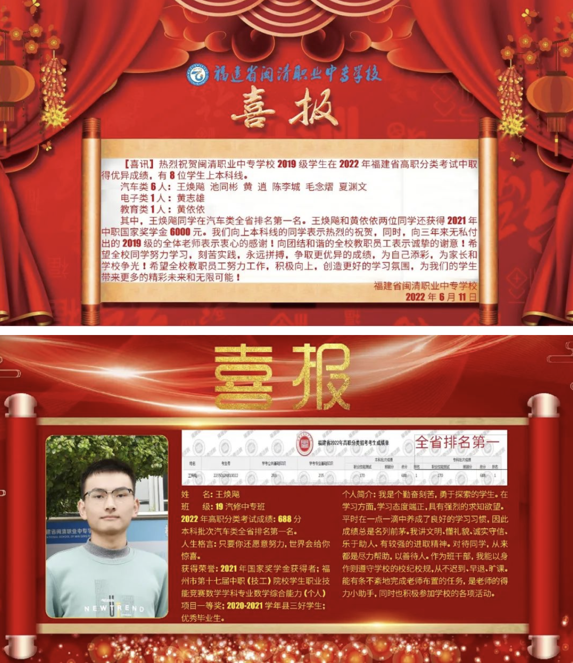 热烈祝贺闽清职业中专学校2019级学生在2022年福建省高职单招考试中取得优异成绩,有8个学生上本科线(汽车类6人,电子类1人,教育类1人),分别是:王焕飚,池同彬,毛念熠,夏渊文,黄逍,陈李城,黄志雄,黄依依,其中,汽车类王焕飚同学在全省排名第一名。另外,王焕飚和黄依依两个同学还获得2021年国家中职奖学金6000元。我们向上本科线的同学表示热烈的祝贺,同时,向三年来无私付出的2019级的全体老师表示衷心的感谢!向团结和谐的全校教职员工表示诚挚的谢意!希望全校同学努力学习,刻苦实践,永远拼搏,争取更优异的成绩,为自己添彩,为家长和学校争光!希望全校教职员工努力工作,积极向上,创造更好的学习氛围,为我们的学生带来更多的精彩未来和无限可能!