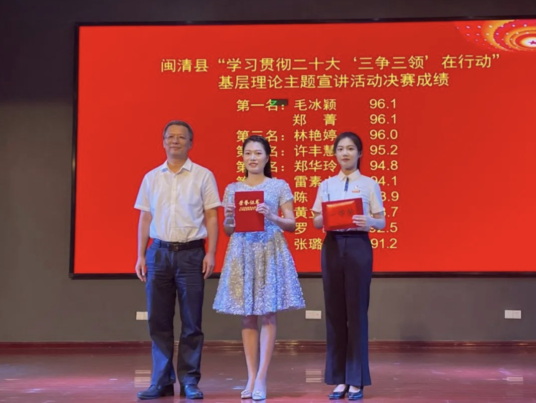 6月28日,由中共闽清县委宣传部主办,中共闽清县委文明办、闽清县教育局、闽清县文体旅局、闽清县文联、闽清县融媒体中心和闽清县新时代文明实践中心协办的2023年闽清县“学习贯彻二十大 ‘三争三领’在行动”基层理论主题宣讲决赛活动在县文化馆五层多功能厅成功举行。我校青年教师毛冰颖凭借出色的表现荣获宣讲比赛第一名。