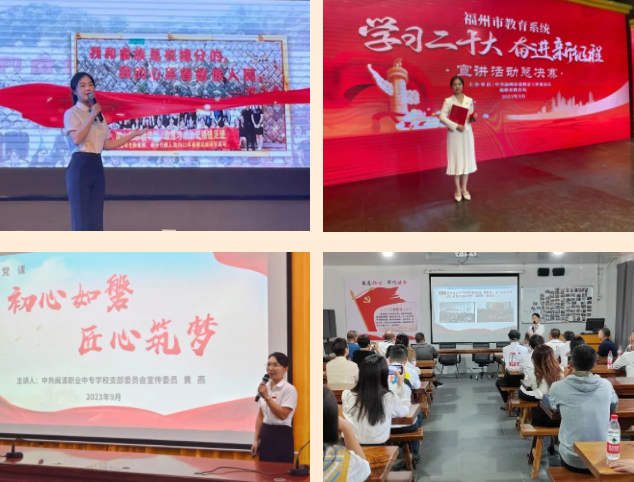 传递正能量,展现新风采。优秀青年教师毛冰颖参加福州市“学习二十大 奋进新征程”宣讲、闽清县“学习贯彻二十大‘三争三领’在行动”基层理论主题宣讲、闽清县第六届职工讲解员技能竞赛分别荣获铜奖、第一名和一等奖;党支部宣传委员、教科室主任、省级课程思政示范课程名师团队核心成员黄燕分别以《初心如磐 匠心筑梦》《初心映使命 匠心谱华章》为题为县直机关工委举办的党组织书记培训班以及南平、福州地区七所合作学校党建、思政共建座谈会的领导、老师声情并茂地演绎了二堂生动精彩的微党课。两位老师立足我校党建工作实际,多维度展现我校党员教师坚定理想信念、陶冶道德情操、涵养扎实学识、勤修仁爱之心,努力开创学校“党建+思政”工作新局面,把“三争三领”行动和主题教育工作落实在教育教学第一线,让党徽在毅行逐梦的三尺讲台上熠熠生辉的良好风貌,深受各位领导、老师的高度赞誉和充分肯定。