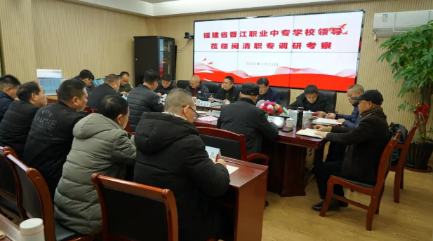 2024年1月23日,福建省晋江职业中专学校党委书记陈惠群、原校长陈华兵、党委委员副校长魏振祥、党委委员刘贵德、党委委员蔡双文、党建办主任李兆民、办公室副主任郭良德一行来到闽清职专调研,福建船政交通职业学院通识教育学院院长方儒钦、福建船政交通职业学院对外交流中心副主任、机械学院副院长、闽清职专常务副校长曾思通、福建省闽清职业中专学校书记、校长陈友水等校级领导及中层干部陪同调研。