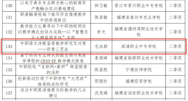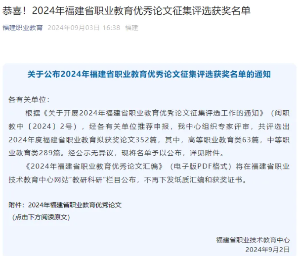 耕耘是最美的姿态,收获是最好的成长。近期,在福建省职业技术教育中心组织的关于2024年福建省职业教育优秀论文征集评选中,我校教师毛冰颖撰写的论文荣获二等奖。