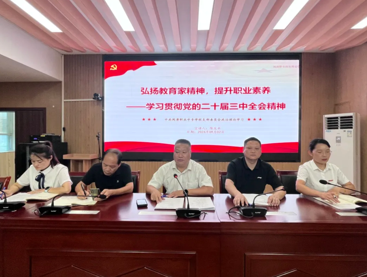 陈友水校长强调,要弘扬教育家精神,大力营造尊师重教浓厚氛围,弘扬践行教育家精神。今年9月10日是我国第40个教师节,今年教师节主题是“大力弘扬教育家精神,加快建设教育强国”,闽清职专要在全校范围内大力营造尊师重教浓厚氛围,弘扬践行教育家精神。作为新时代教师,要率先学习领会党的二十届三中全会精神,深刻理解中国式现代化的内涵与要求,不断提升自身素质与师德修养,将学习成果转化为指导实践、推动工作的强大武器,坚持立德树人,严守党纪底线、师德师风底线,做践行教育家精神的新时代好教师。
