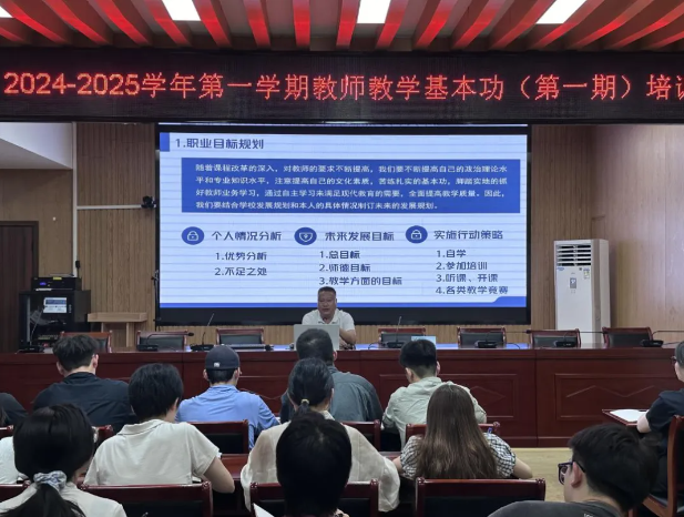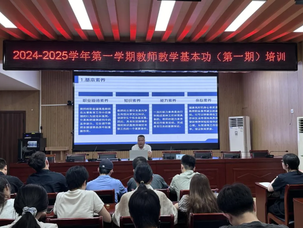 在讲述“教师基本素养”时,他强调了教师应具备的素养涵盖职业道德、知识、能力和身心素质。他特别强调了知识素养和能力素养的重要性,并鼓励新教师在未来的教学工作中持续磨练,以提高自身的专业技能。