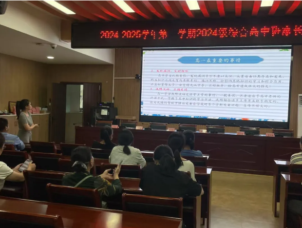 安保处王致本主任表示学生安全是首要任务,安全工作涵盖禁止骑电动车确保出行安全、重视饮食健康养成良好习惯,以及网络安全引导防范电信诈骗等内容,希望家长时刻警惕,为孩子的成长保驾护航。德育处吴仁泉主任介绍了学校在心理健康和品德教育方面的工作,结合现实案例,呼吁家长关注孩子情感需求,帮助其树立正确的价值观人生观。教务处钱敏主任对学生的高中学业课程设置、合格性考试等内容进行介绍,分析了月考情况,并表示学校将通过加强教研,不断提升教学质量,确保学生在良好的学习环境中取得进步。