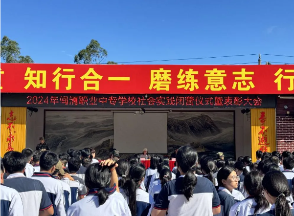 青春似火自强不息,少年意气百炼成钢。为期5天的社会实践即将落幕,11月15日早10点在基地开展闽清职专2023级社会实践活动闭营仪式暨表彰大会,德育分管副校长赖洁星对学生们在本次社会实践活动中的表现给予了高度评价,并鼓励他们将所学所得应用到未来的学习和生活中去。最后,与会领导们为本次社会实践活动中表现优异的个人及拔河比赛获奖班级颁发了荣誉证书。