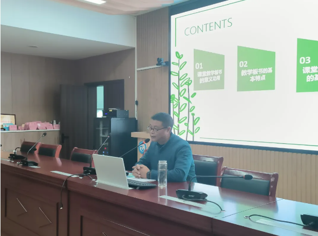 此次培训由闽清职专办公室副主任毛行术主讲。他以《课堂教学板书设计》为题,从课堂教学板书的意义功用、基本特点、基本形式、常见失误及改进方法等四个方面进行阐述。