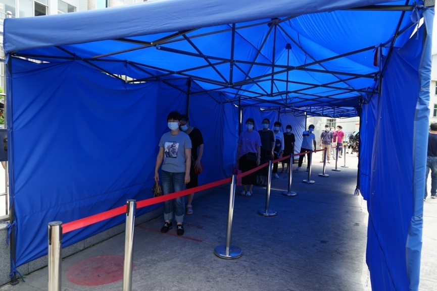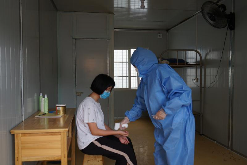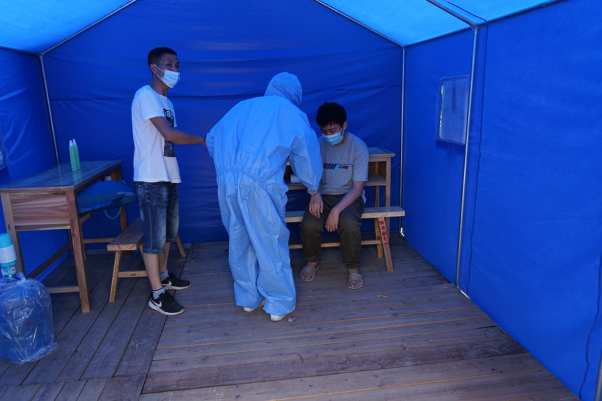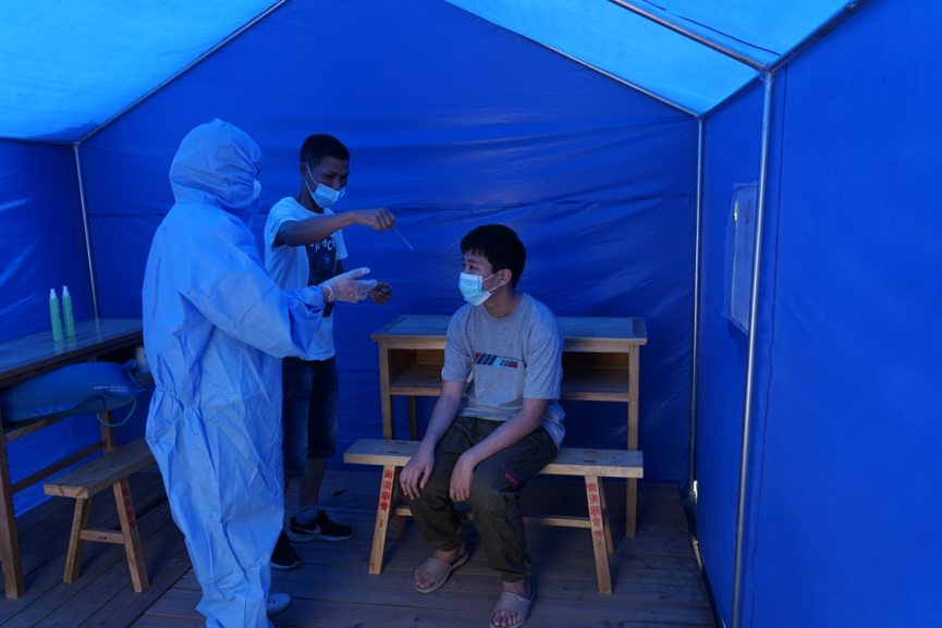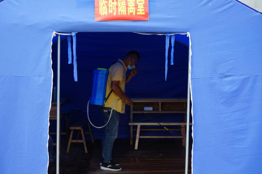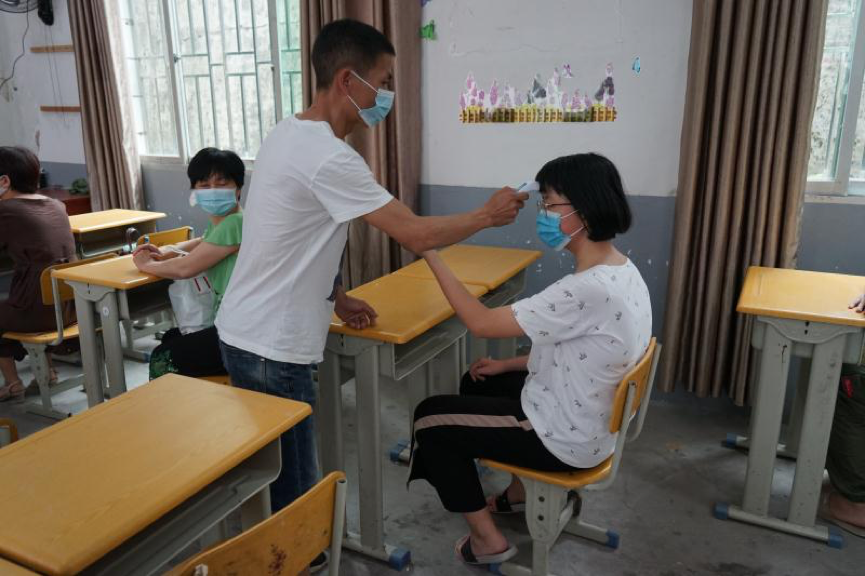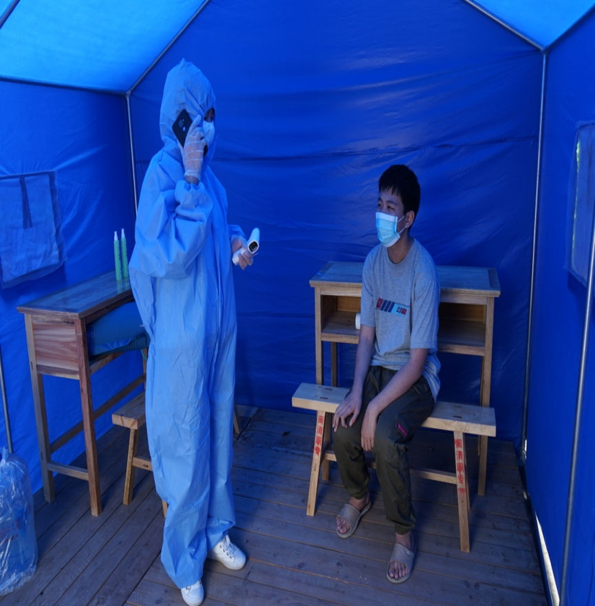 场景3:发现体温超过37.3℃者,由黄祎寿老师带入校门口临时隔离点。校医对其和家人身体健康状况以及是否有接触疫情重点地区往来人员等情况进行询问,并用水银体温计进行复测。