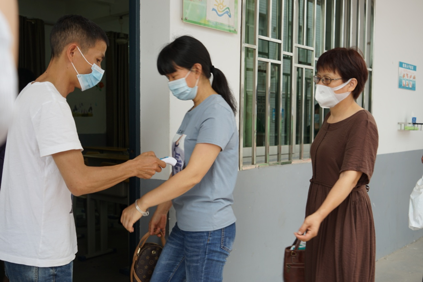 场景1:开学后,师生入校前分组分散排队进行晨、午检,进入校园师生保持1米远距离按序通过热成像仪自动检测通道,保安谢聿旺、谢万庆和值班老师黄祎寿组织师生进入检测和查看体温状况。