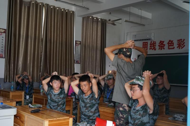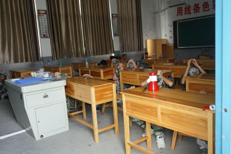 当总指挥讲解完毕后,拉响了防空警报,各班同学马上进行了自我急救,双手抱头,蹲藏在课桌底下以防被坠物砸伤