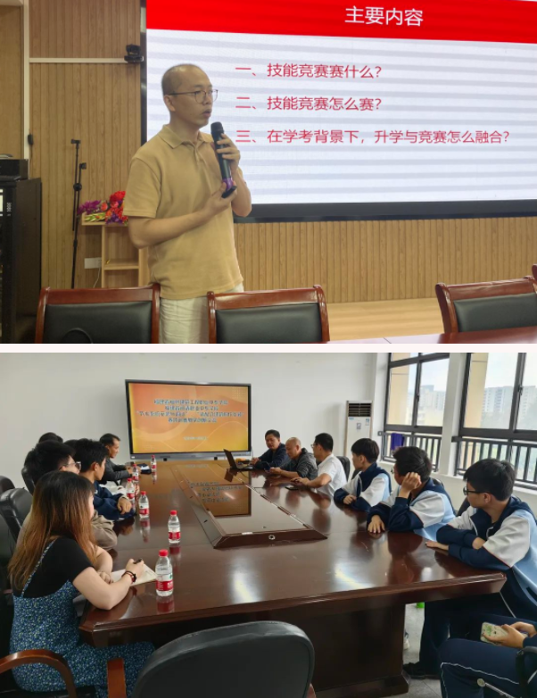 潜心备战迎赛事,交流共进促成长。为迎接此次技能大赛,我校多层级召开动员、培训会议,制定学习指导计划。参赛选手和指导老师时常废寝忘食在各实训室加班加点,忘我备战,充分展现了特别能吃苦、特别能战斗、特别能攻坚、特别能奉献的精神风貌;同时采取请进来走出去方法为大赛蓄势赋能。福建工业学校信息专业教学部高级讲师黄河老师以《学业水平考试背景下中职技能竞赛备赛策略》为主题,来校开专题讲座,帮助我校教师提高指导学生的能力和水平;多批次组织指导教师和参赛学生前往福州建筑工程职业中专学校、长乐职业中专学校等院校进行赛前训练、教学交流,共同提高。