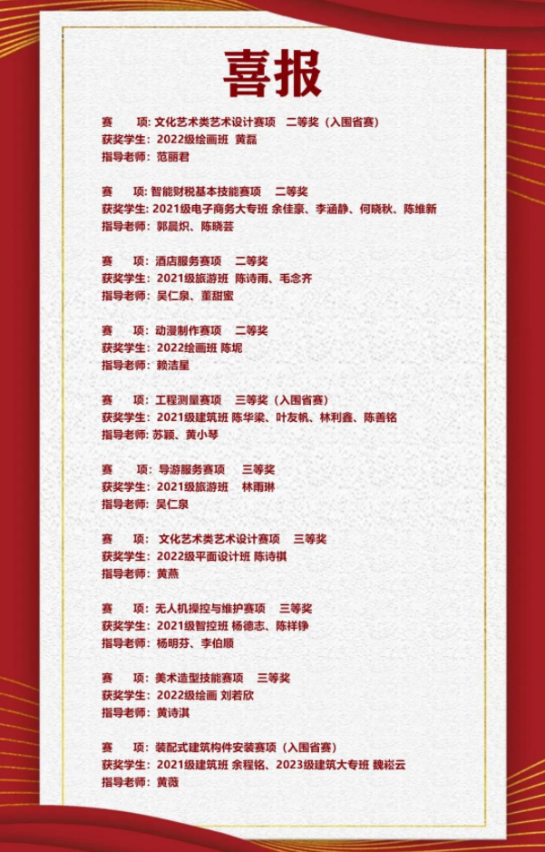 奋勇拼搏创佳绩,莘莘学子展风采。此次技能大赛我校派出5个师生团体及12名学生个人参赛。经过激烈角逐,成绩喜人,共获4个二等奖,6个三等奖,其中艺术设计、工程测量、装配式建筑构件安装等3个赛项入围省赛,创入围省赛项目数量历史新高。