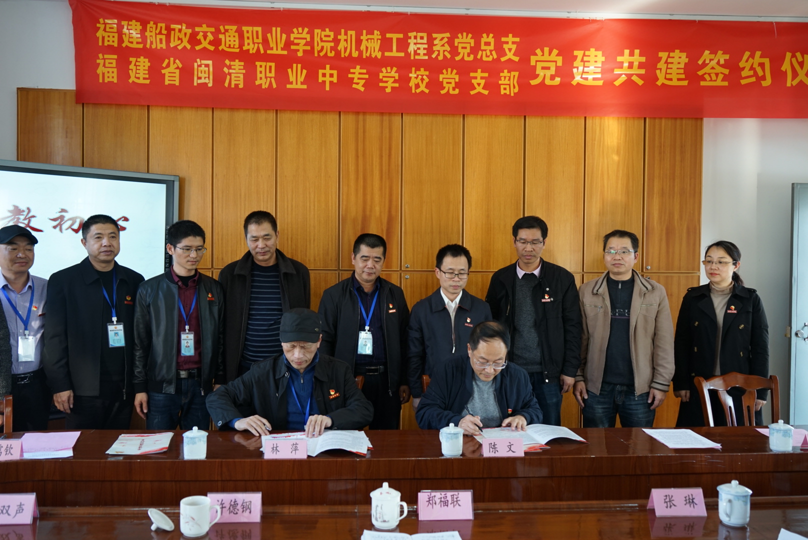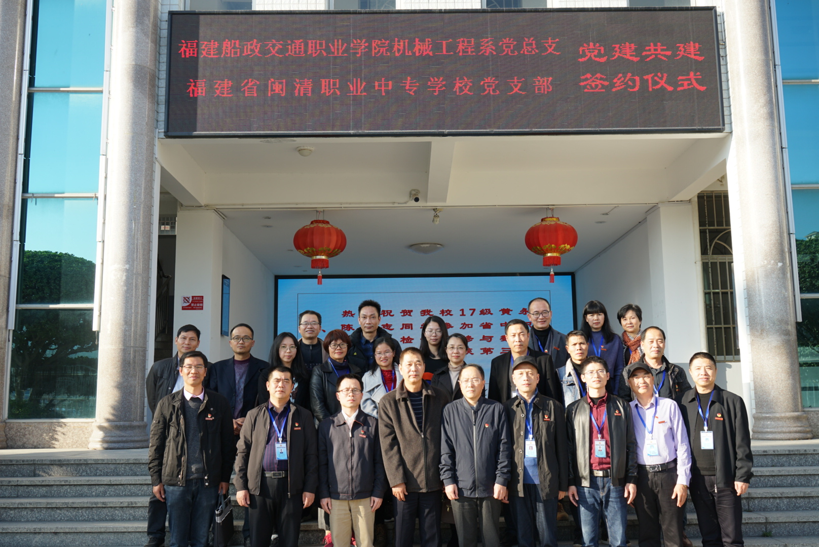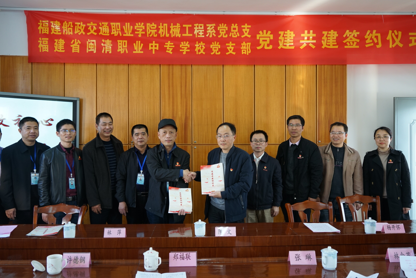 为了深入贯彻“不忘初心,牢记使命”主题教育有关要求,构建“资源共享、优势互补、互相促进、共同提高”的党建工作新格局,12月25日下午,在闽清职专“党员之家”举行了福建船政交通职业学院机械工程系党总支和闽清职专党支部“党建共建”协议签约仪式。福建船政交通职业学院机械工程系党总支书记陈文、主任杨开怀以及机械工程系领导、党员代表和闽清职专领导、党员代表共25人出席签约仪式。福建船政交通职业学院方儒钦教授也莅临现场指导。仪式由闽清职专党支部书记林萍主持。
