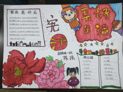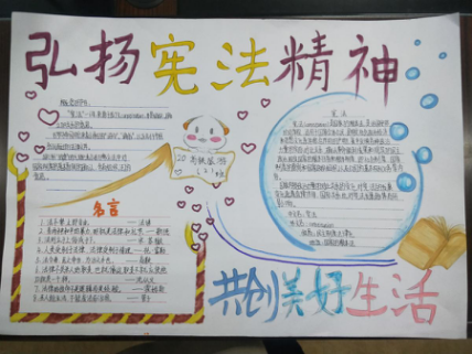 组织各班级制作一份《弘扬宪法精神 共创美好生活》法治教育主题手抄报,完成一期学宪法讲宪法主题班刊。