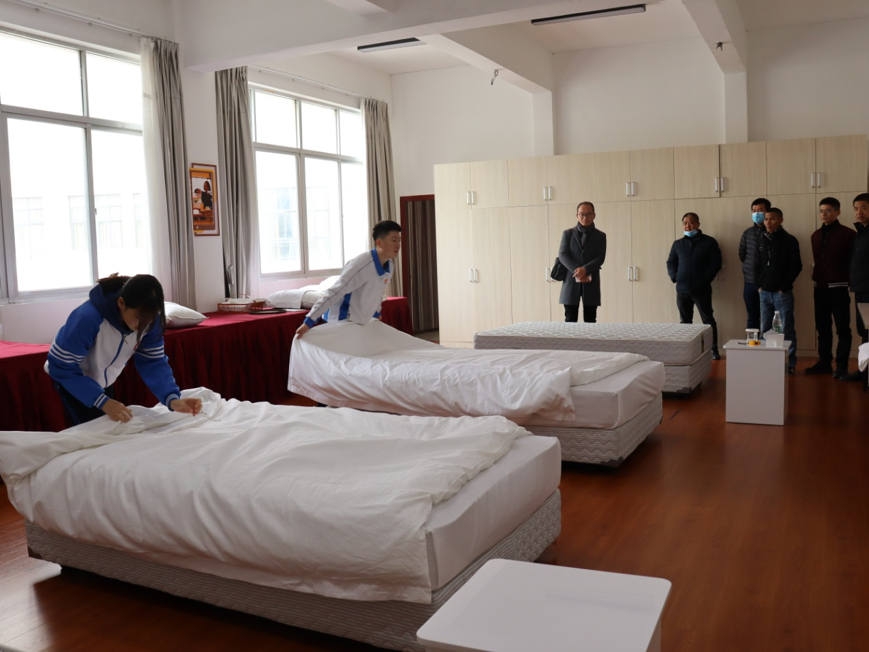 在华侨职专领导带领下,我们参观了旅游与酒店实训室,学生为我们表演了泡茶工序以及客房铺床流程,她们娴熟规范的动作,谦恭文明的话语,显示良好的专业素养,给我们带来一场视觉上盛宴。