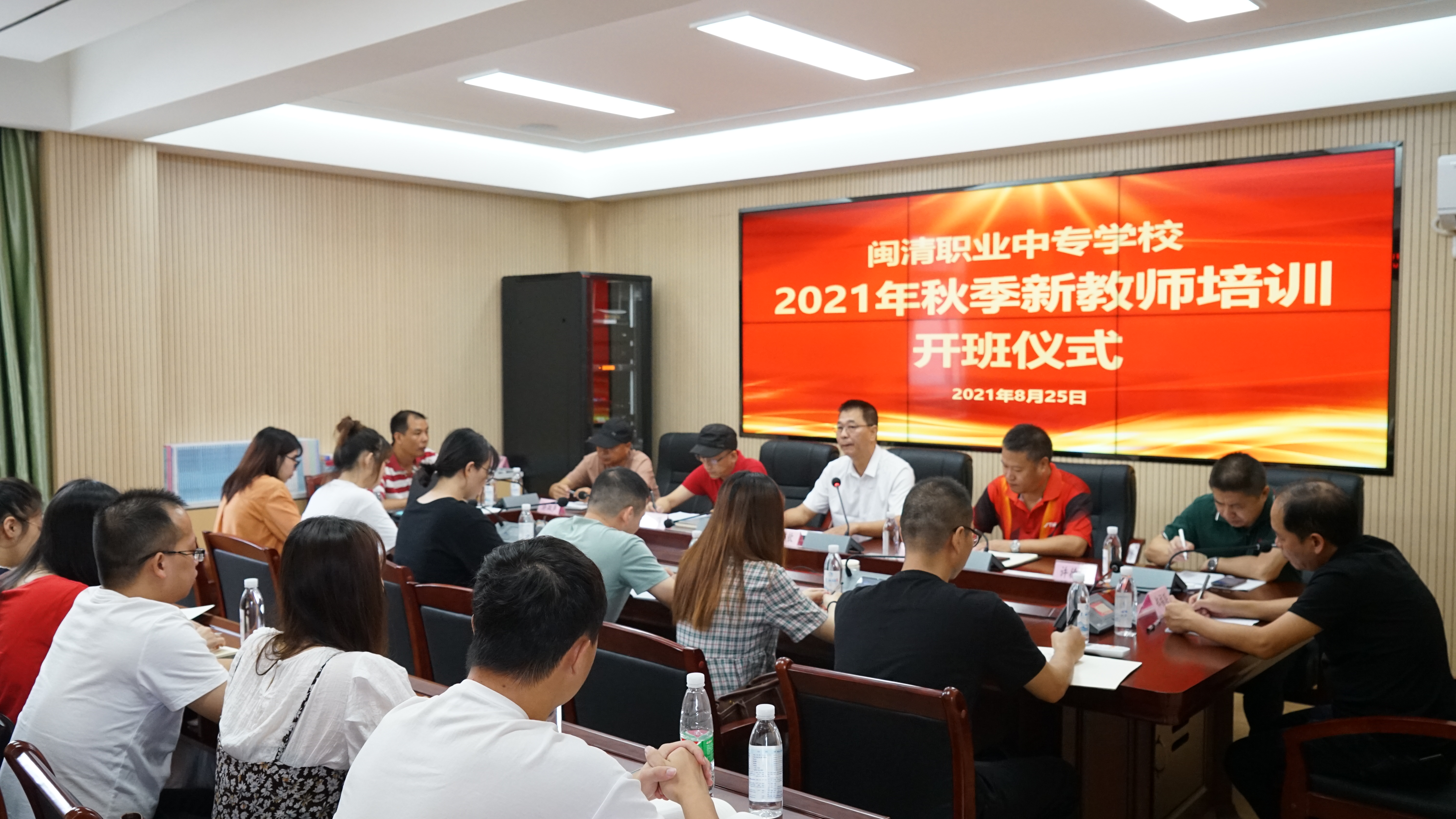 2021年8月25日上午,我校2021年新教师岗前培训在学校四楼会议室如期召开。县教育局方儒钦副局长、陈友水校长、林萍书记、许双声副书记、许德钢副校长、郑福联副校长、教科室马昭向主任及2021年所有新进教师参加了本次开班仪式,会议由许德钢副校长主持。