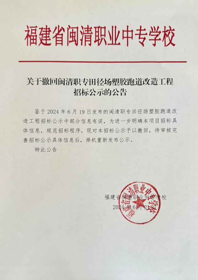 关于撤回闽清职专田径场塑胶跑道改造工程招标公示的公告