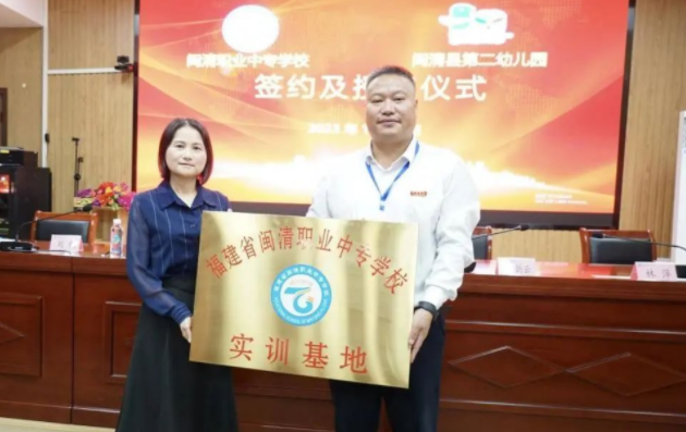 闽清职专陈友水校长向闽清梅溪镇中心幼儿园刘枫园长授校企实训基地牌匾