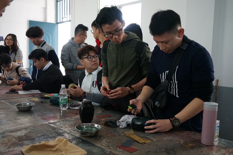 许德越老师指导马来西亚的同学们进行漆器制作体验,现场氛围热闹非凡,来自异国他乡的同学们对漆器有着浓厚的兴趣,操作间隙不断地提问。