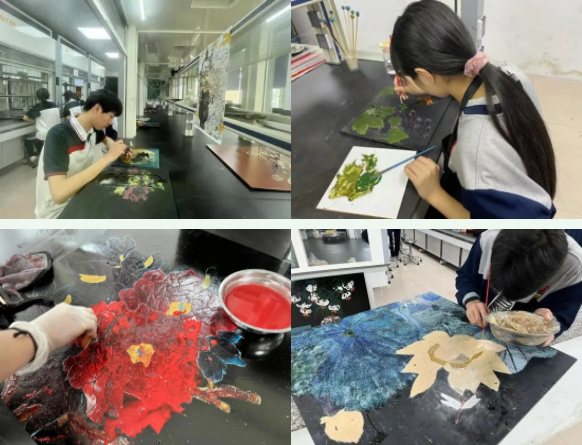 美育(漆画)基地面向全校学生,依托学生社团,每周固定时间开展活动。配备专业教师,制定详细活动计划进行教学。既有理论宣讲,也有技能实操示范,学生兴致勃勃,训练认真,制作精心,优秀作品不断涌现。