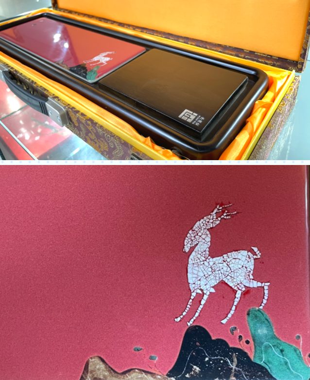 我校的合作单位——福建省福州市欣享悦实业有限公司也展出了瓷胎漆艺系列作品。其一的“畅想”系列用抽象的漆语言来表达意境,湖泊与沙漠戈壁交织成歌,画面和谐自然;其二是“九色鹿”系列。敦,大也,煌,盛也。敦煌正如它的名字一样,是座熠熠生辉的文化宝库。选取敦煌壁画的九色鹿元素,用大漆技法中的蛋壳镶嵌技法制作而成,巧妙地在瓷板上结合大漆,创新创造出瓷胎漆盘这一既实用又美观的艺术品。这些作品让参观者得到艺术启迪,大家流连忘返,沉醉在浓重的艺术氛围中。