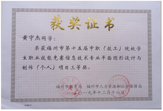 2019年,黄守杰同学获《平面设计技术》项目市赛三等奖,指导老师:黄燕