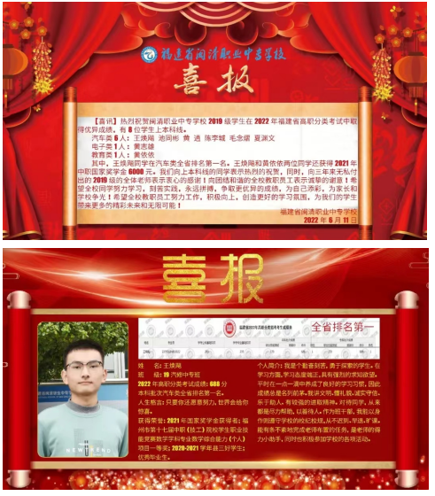 通过参加福建省学业水平考试暨高职分类招考,进入本、专科院校汽车类、交通类等专业继续深造学习,2022年的“职教高考”,我校本科上线共8人,汽修、新能源教研部本科上线人数占6人。其中,王焕飚同学更是以全省汽车大类第一名的成绩被厦门理工学院录取。